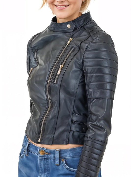 Handcrafted Women's Sheepskin Leather Biker Jacket – Premium Biker Style Black