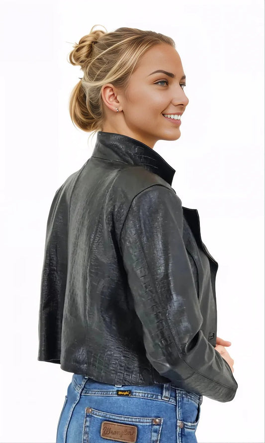 Handcrafted Women's Sheepskin Leather Jacket – Cropped Black Crocodile