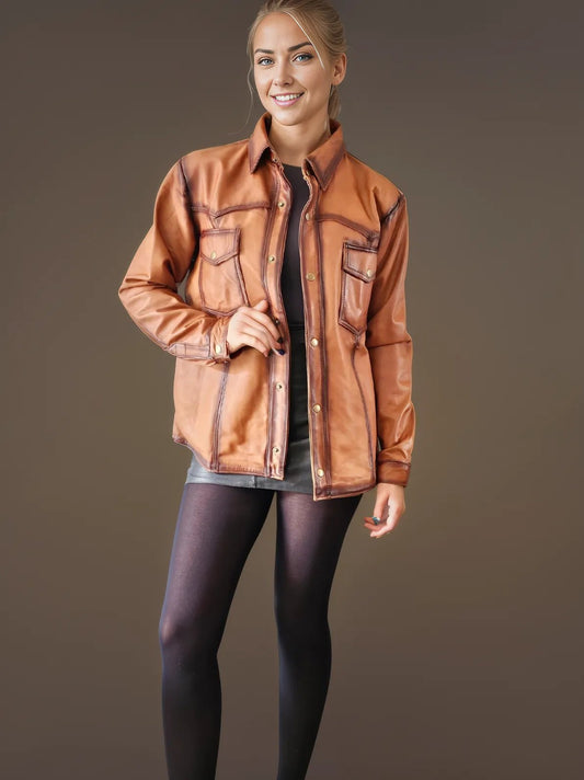 • Handcrafted Women's Sheepskin Leather Shirt – Western - Style Vintage Honey Button - Up - Tenku Designs